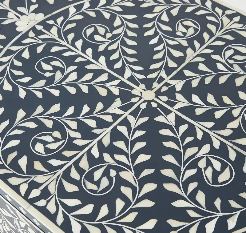 Bone inlay is a traditional handicraft that has been passed down through generations in India. The artisans at Prakash Handicraft masterfully create these stunning pieces by delicately placing small pieces of buffalo bone or mother of pearl into intricately carved patterns on furniture, such as console tables. The bone is skillfully set in a colored resin, forming breathtaking designs that exude elegance and luxury.