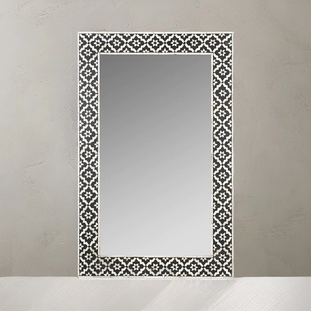 Versatility is a key aspect of the Bone Inlay Modern Wall Mirror. Its adaptability allows it to complement various design themes, from contemporary and mid-century modern to industrial and eclectic styles. Whether placed in the living room, bedroom, hallway, or bathroom, this mirror effortlessly enhances the visual appeal of any room.