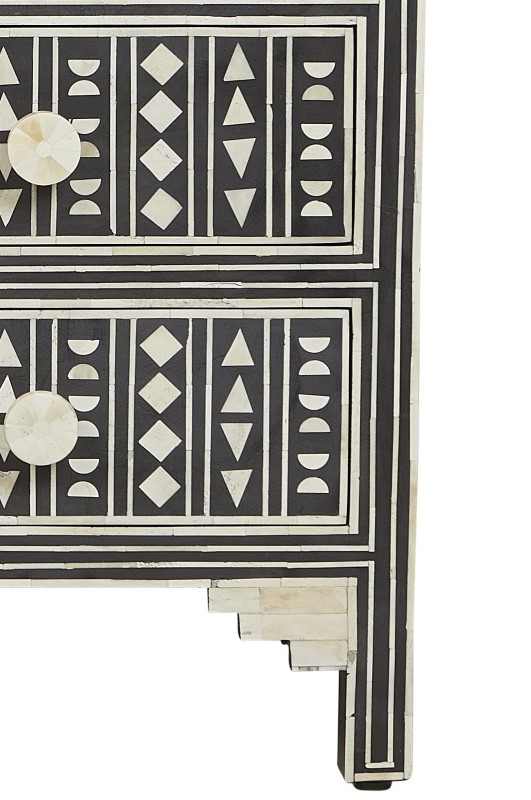 Bone inlay, an art form rooted in history, has captured hearts across the ages. The Inlay Dresser showcases the mastery of this craftsmanship, combining buffalo bone, seashell, MDF, wood, and resin to create intricate patterns that grace the dresser’s surface. Each piece is meticulously handcrafted by skilled artisans, reflecting their dedication and precision.