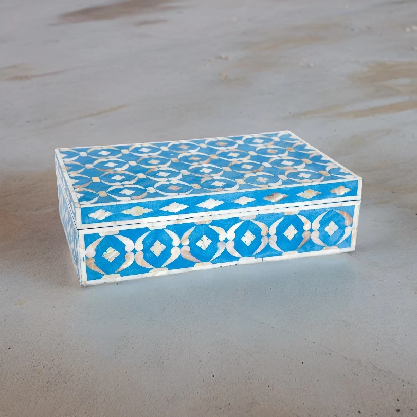 At Prakash Handicraft, we take immense pride in preserving the traditional Indian art of Mother of Pearl inlay. Our skilled artisans, inheritors of a rich legacy, pour their heart and soul into crafting each Mother of Pearl Handmade Gift Box. Using premium quality materials like resin, buffalo bone, MDF, and solid wood, they create boxes that epitomize artistry, durability, and excellence.