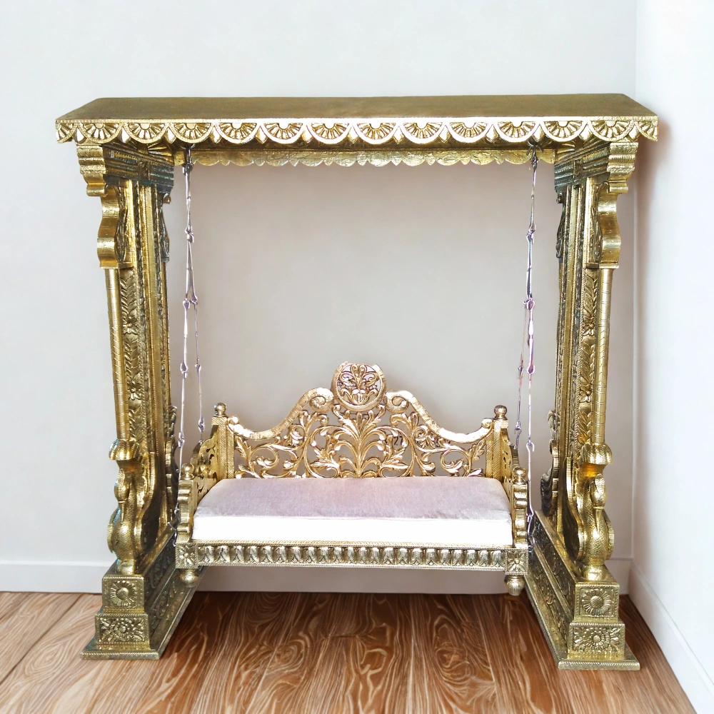 Skilled artisans have elevated this swing into a true work of art. The frame is meticulously clad in pure brass, adding a rich golden tone that instantly enhances the visual appeal. Furthermore, the surface features hand-carved designs inspired by timeless Indian motifs, offering both sophistication and cultural significance. Every inch of this masterpiece is adorned with kantrai work, a traditional detailed engraving technique that brings intricate patterns to life.