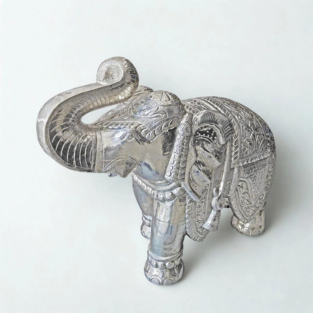 Not only does the elephant serve as a decorative marvel, but it also stands as a symbol of luck, power, and stability in Indian tradition. Placing it in your space enhances positive energy, creates balance, and adds a touch of noble elegance to your surroundings. With its blend of spiritual meaning and refined artistry, this decorative silver elephant becomes a cherished part of your living environment.