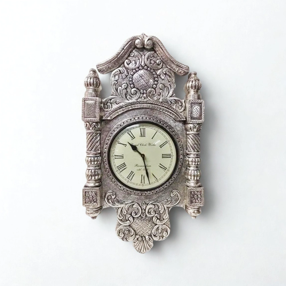 What truly sets this piece apart is its exquisite pure silver cladding. Skilled artisans carefully cover the teak surface with silver sheets, creating a reflective and luxurious finish. The intricate kantrai work further enhances its beauty, showcasing traditional Indian motifs that add cultural depth and artistic texture. Each detail of the hand carved design is thoughtfully executed to bring timeless patterns to life. Following this, expert buffing techniques give the clock an impressive shine, while a protective lacquer coating keeps it safe from tarnish and corrosion. As a result, the clock retains its brilliance over time without demanding extensive upkeep.