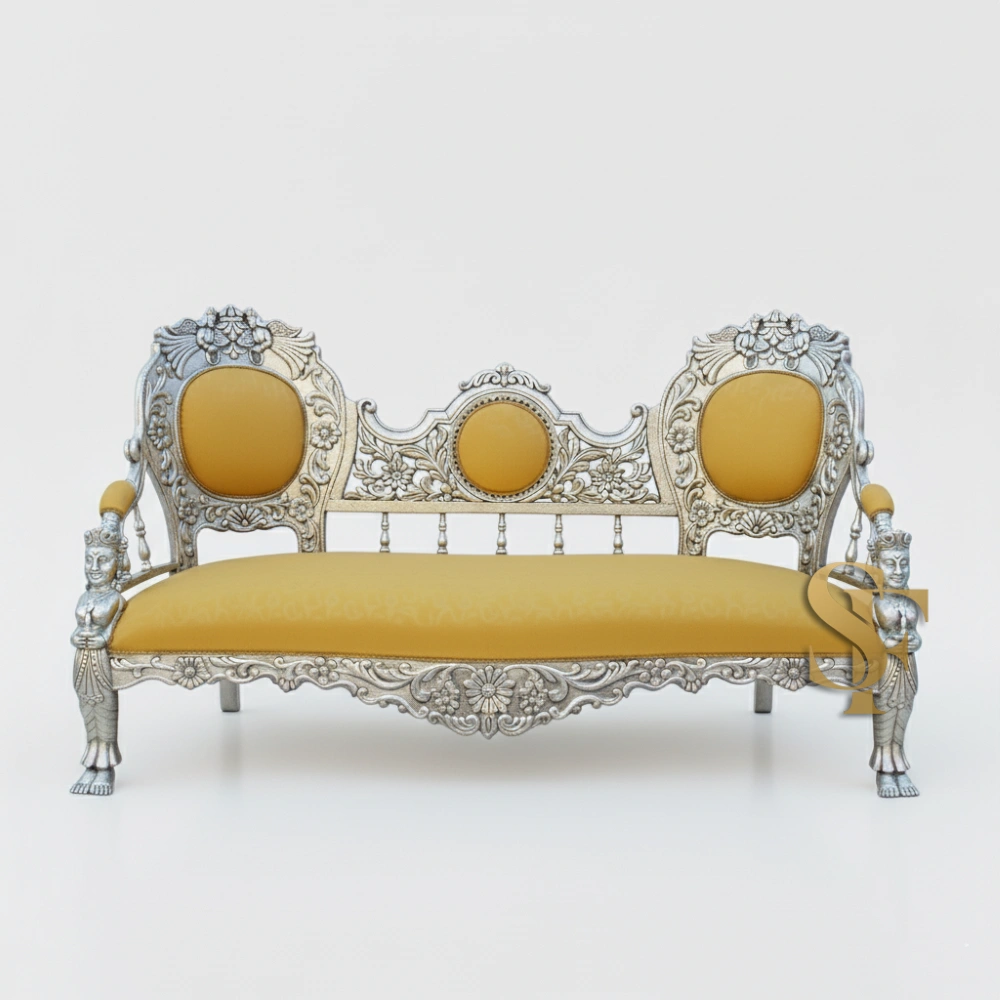 This exquisite Indian Silver Sofa is handcrafted from teak wood and clad with fine silver. It is a unique and eye-catching piece that will add a touch of luxury and elegance to any room. This luxury Sofa is comfortable and sturdy, making it perfect for any seating arrangement. It is sure to be the centerpiece of any room and will be a conversation starter for years to come.
