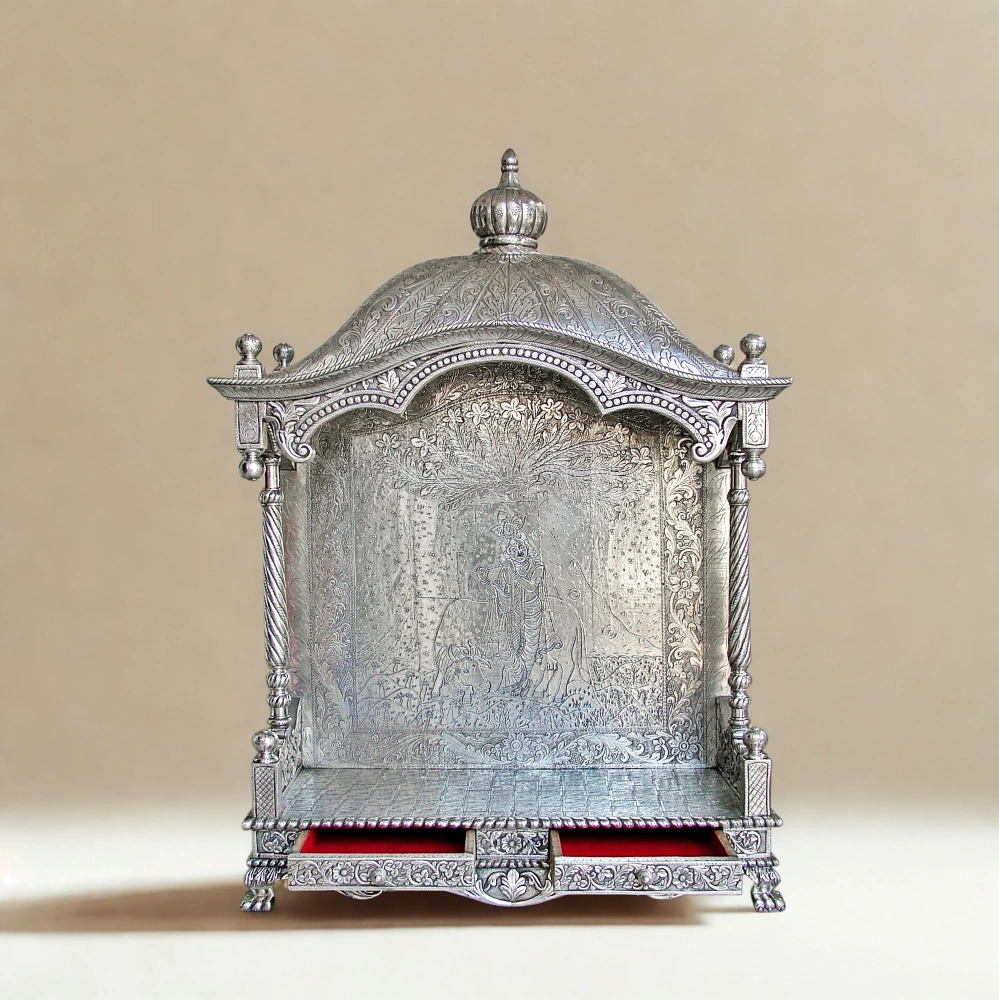 This is a Pooja Temple for Home, it is handcrafted from teak wood and clad with Pure silver. It is a unique and eye-catching piece that will add a touch of luxury and elegance to your Pooja room. This Pooja Temple is well carved, making it perfect for your home. It is sure to be the main attraction of any home and will be a conversation starter for years to come.