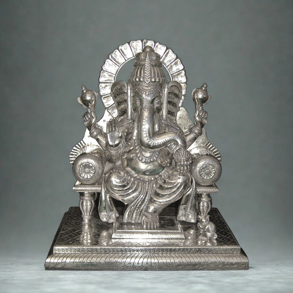 This Pure Silver Ganesh Idol Online is handcrafted from teak wood and clad with 999 pure silver. It is a unique and eye-catching piece that will add a touch of luxury and elegance to any Pooja room. This Pure Silver Ganesh Idol Online is well-carved, making it perfect for your Pooja room. It is sure to be the main attraction of any home and will be a conversation starter for years to come.