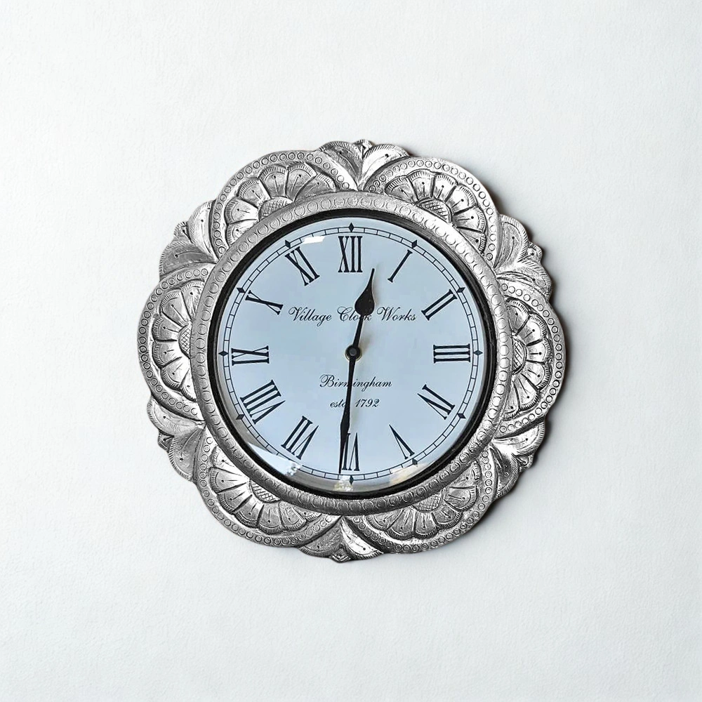 The Pure Silver Wall Clock seamlessly blends age-old artistry with modern functionality, creating a statement piece that enhances any living space. Crafted from premium old building teakwood, this clock not only reflects durability but also highlights our commitment to sustainable practices. Our artisans select aged teak for its strength and natural beauty, ensuring a sturdy and long-lasting frame that supports the intricate design.