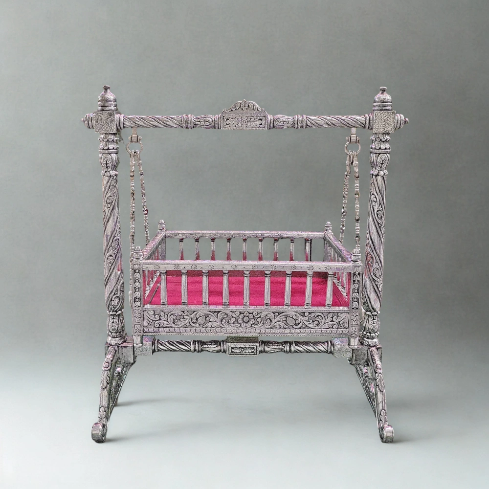 The Silver Antique Cradle stands as a tribute to India’s timeless craftsmanship and devotion. Designed for families who cherish tradition and elegance, this handcrafted cradle brings grace, safety, and spiritual warmth into your home. Every detail reflects the touch of artisans who honor ancient Indian artistry while ensuring the cradle serves its purpose with beauty and strength.