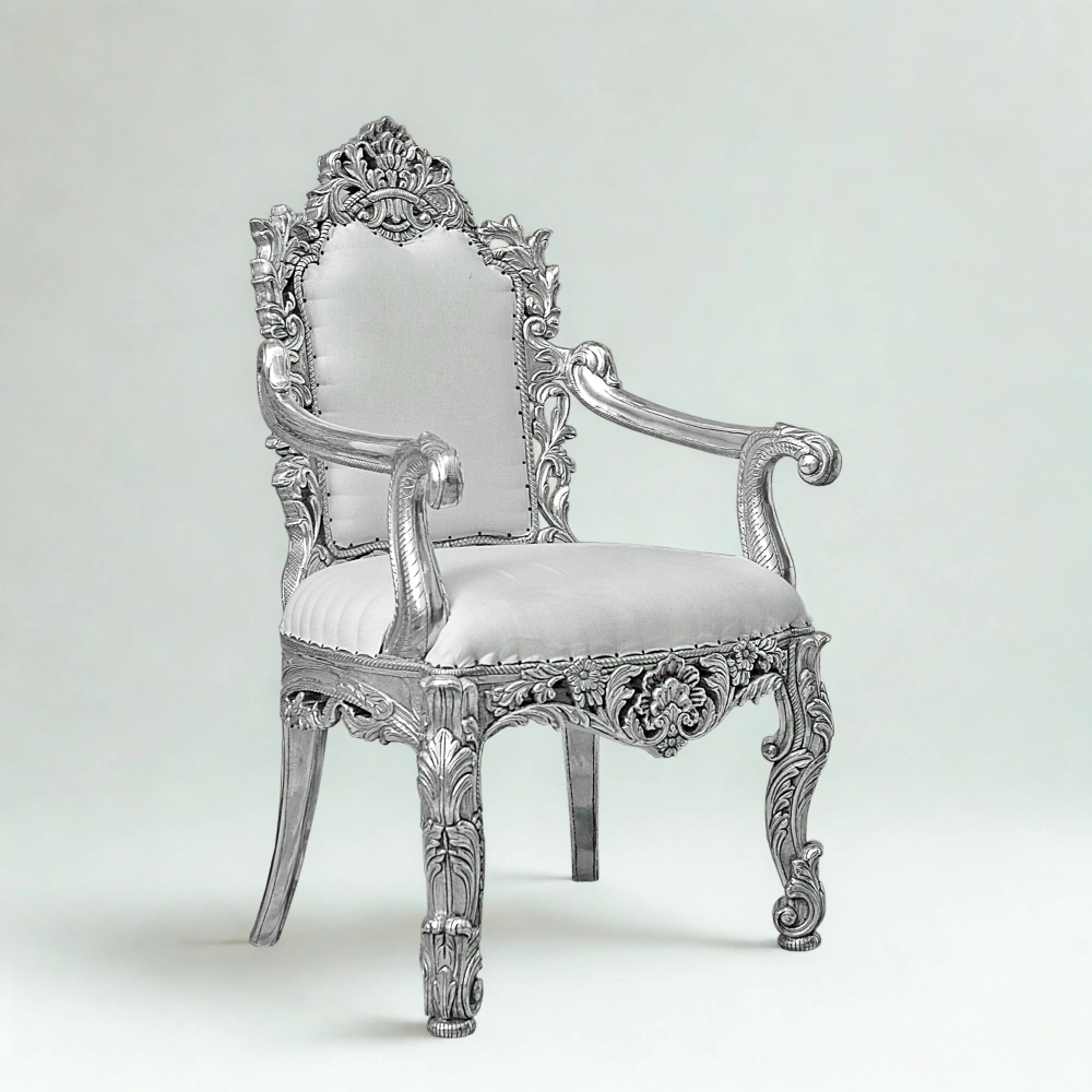 Furthermore, the chair features pure silver cladding applied by highly skilled artisans. This silver finish radiates a brilliant shine that instantly enhances any living space. The surface of the chair boasts an intricate hand-carved design that reflects India’s rich heritage in furniture making. In addition, our expert craftsmen add exquisite kantrai work to accentuate the details and provide a level of refinement rarely found in modern furniture.