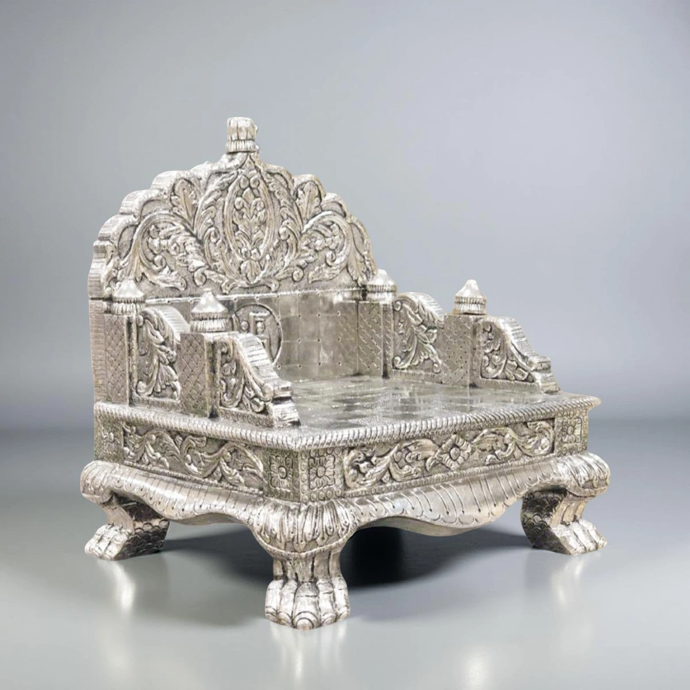 To enhance its beauty, the entire piece receives a thorough buffing polish that brings out a brilliant shine. A transparent lacquer is then applied to protect the silver from tarnishing and preserve its radiant glow for years. The final finish gives the singhasan its luxurious appearance while requiring minimal maintenance.
