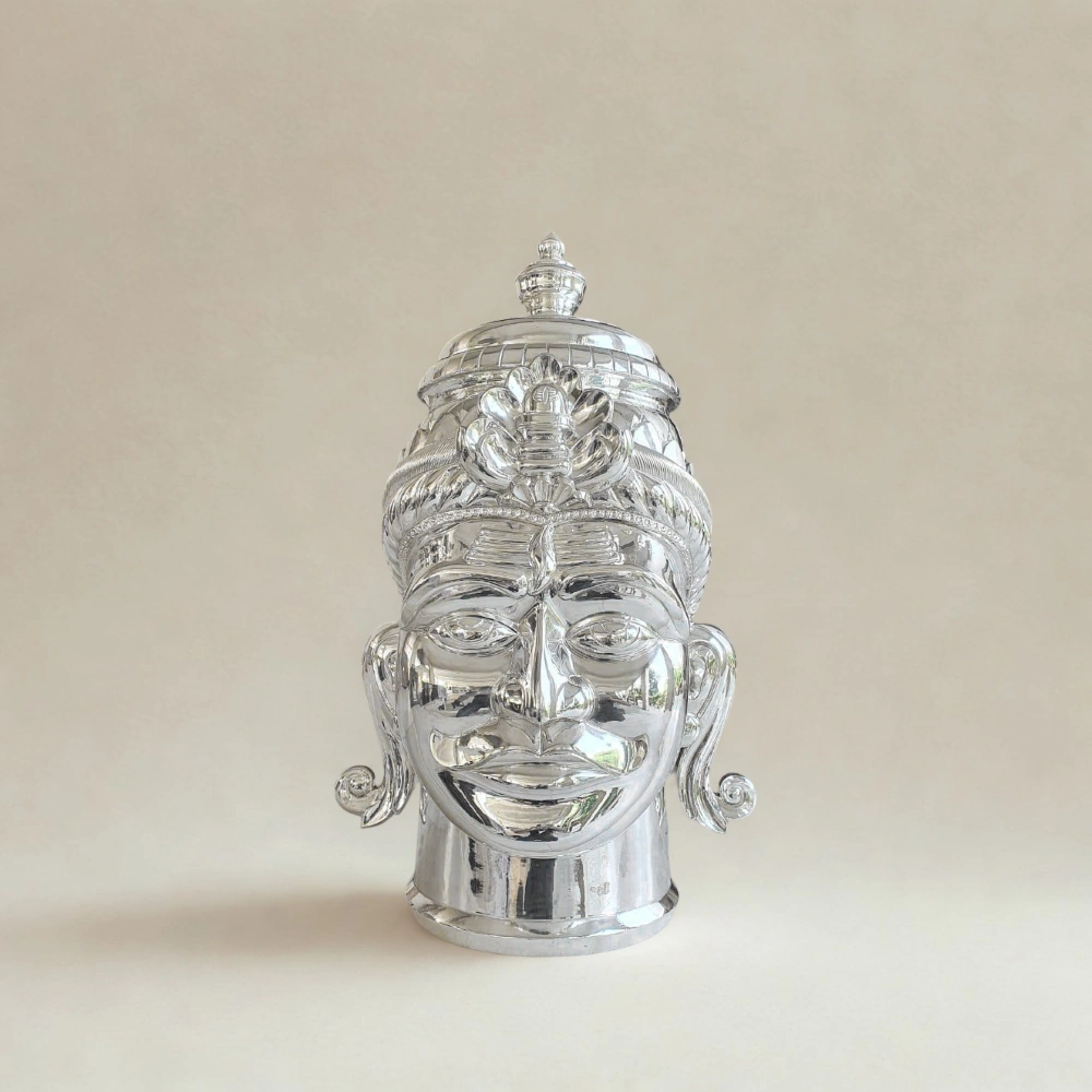 Artisans meticulously apply kantrai work, a traditional hand-engraving technique that enhances fine features. This adds dimension, texture, and life to the silver surface. From Shiva’s third eye to the expressive contours of the face, every detail is carved with devotion and precision. Although spiritual, this design also offers visual sophistication, making it suitable for both home temples and artful interiors.